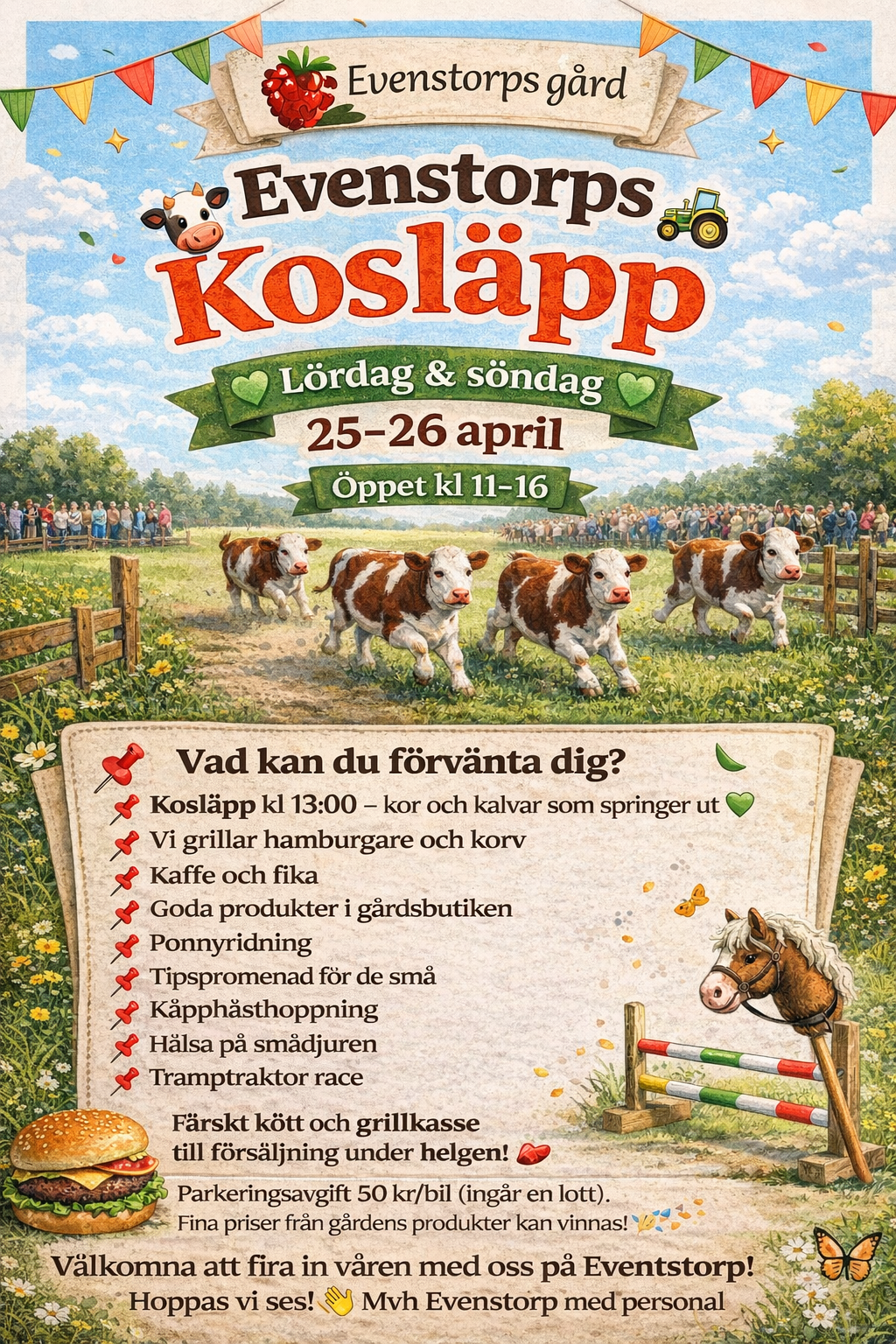 Kosläpp på Evenstorp 25–26 april kl 11–16